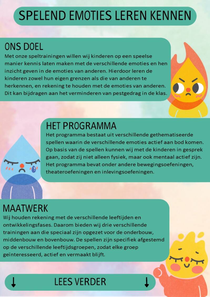 Momenteel ben met meerdere leuke projecten tegelijk bezig. Één van die projecten is dat ik samen met mijn collega acteur Jelle een spelprogramma heb opgezet voor scholen, gericht op het her- en erkennen van emoties bij zichzelf en bij anderen. De kinderen krijgen hierdoor meer inzicht in hun eigen gevoelens en die van anderen wat zorgt voor minder conflicten in de klas. Hier ook de folder van onze speltraining. Neem het eens door! Heel interessant!